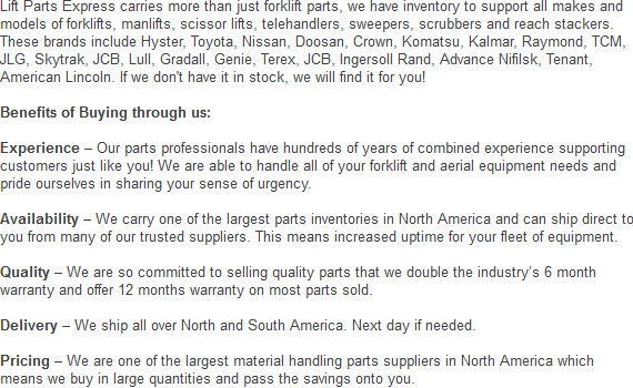 For your entire fleet of lift-trucks, we provide the best prices on all our parts. Give us a phone call now if you are interested in receiving a price estimate for our parts or attachments. Our number is:
